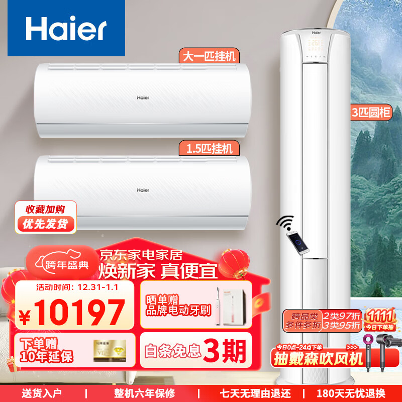 海尔(Haier)两室一厅空调套装 新一级能效变频冷暖空调 大1匹+1.5匹+3匹空调 WiFi智控 光感睡眠 以旧换新价格:10197.00元!