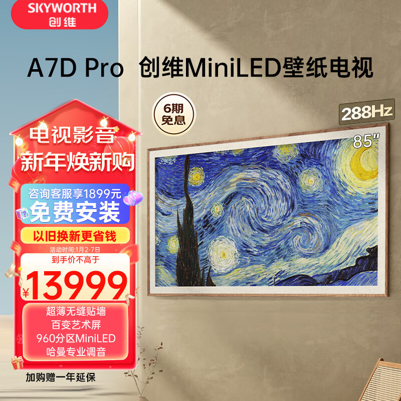 创维壁纸电视85A7D Pro 85英寸超薄壁画艺术电视机 无缝贴墙 960分区Mini LED ADS Pro屏高清巨幕大屏价格:13999.00元!