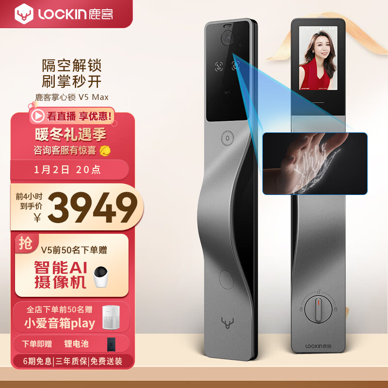 鹿客(LOOCK)掌心锁 V5 Max掌静脉人脸识别猫眼屏智能密码锁APP智联适用左开门价格:4299.00元!