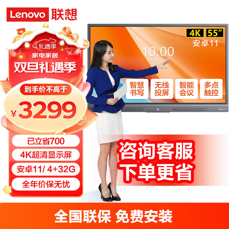联想联想thinkplus 会议平板一体机55英寸 电子白板视频会议教学触摸屏电视商用显示屏 SE55 gen2价格:3299.00元!