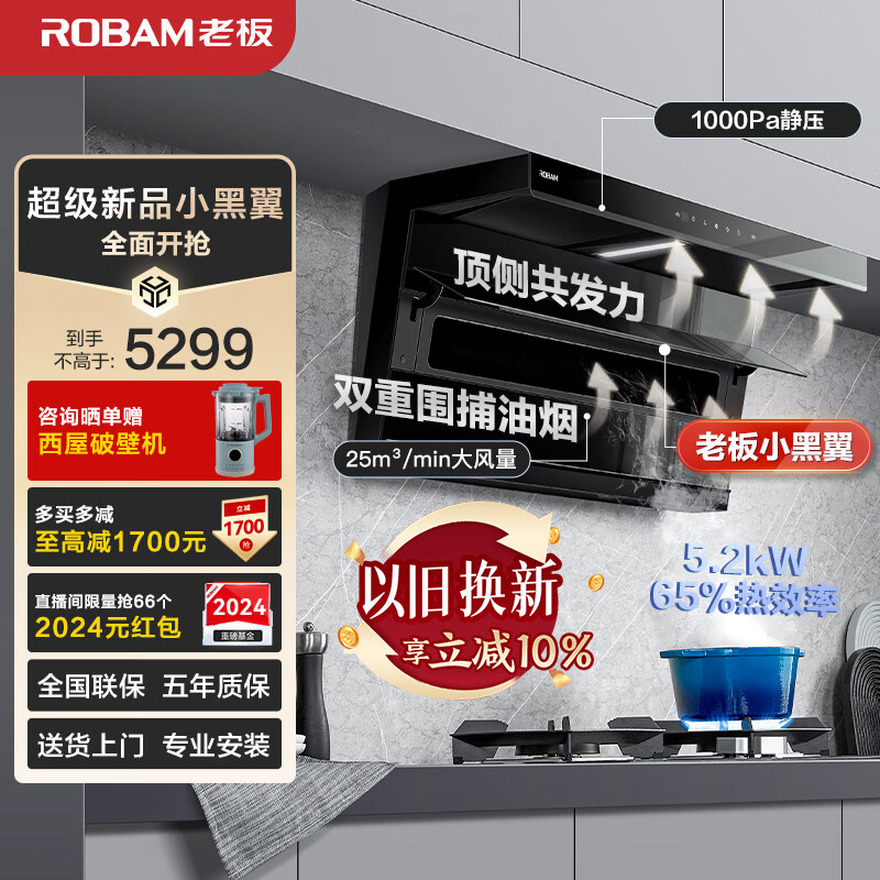 老板(Robam)【小黑翼】油烟机顶侧双吸抽油烟机25立方米7字型吸油烟机燃气灶油烟机27A13-D1烟灶套装价格:5299.00元!