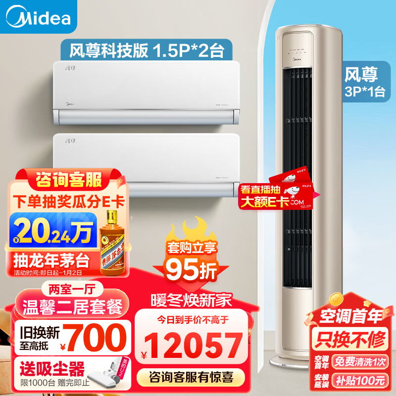 美的(Midea)空调 风尊系列 温馨二居套餐 两室一厅套装(1.5匹风尊科技版一级*2+3匹风尊柜机一级)价格:12797.00元!