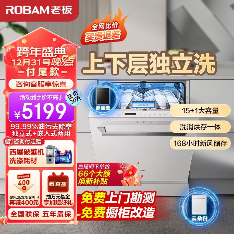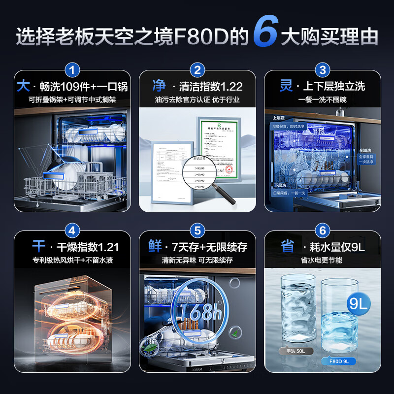 老板(Robam)F80D白天空之境15套大容量嵌入式去重油污洗碗机热风烘干消毒168h长效存储一体机家用独立式分层洗价格:5199.00元!