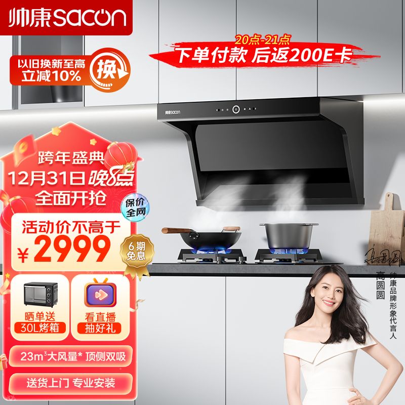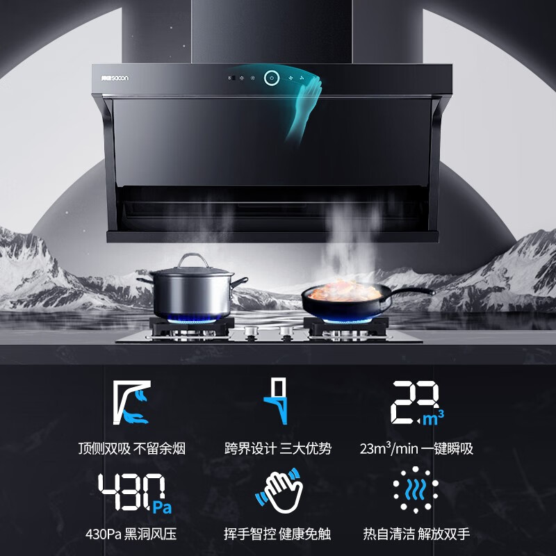 帅康(Sacon)抽油烟机顶侧双吸油烟机 家用23大风量7字机 挥手智控 自清洗烟灶套餐 Y8272+E8D01F天然气价格:2999.00元!