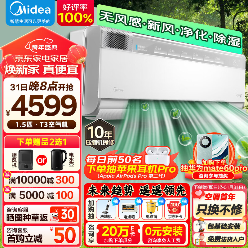 美的(Midea)新风空调1.5匹挂机 t3鲜净感空气机 新一级能效 无风感 壁挂式 卧室空调 KFR-35GW/T3 极地白价格:4599.00元!