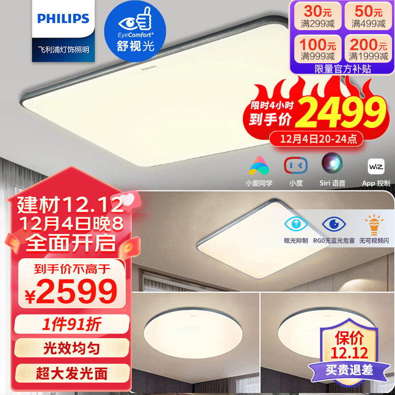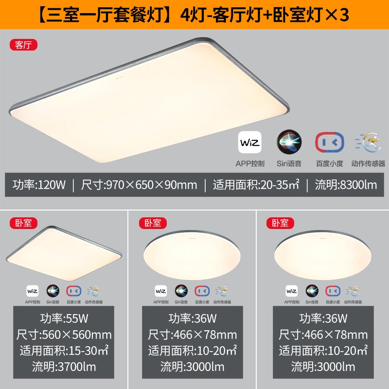 飞利浦led吸顶灯超薄客厅灯餐厅卧室灯智控调光灯具套餐三室一厅 怡轩灰价格:3049.00元!