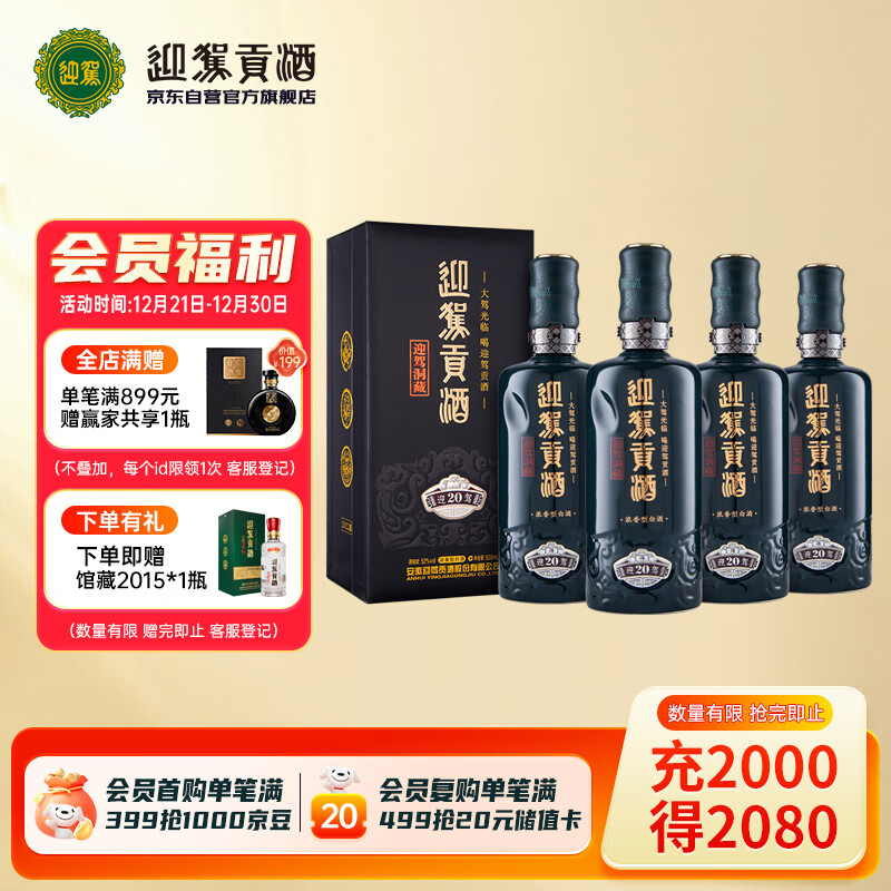 迎驾贡酒 白酒 生态洞藏20 浓香型 52度500ml*4瓶 整箱装 年货送礼价格:2512.00元!