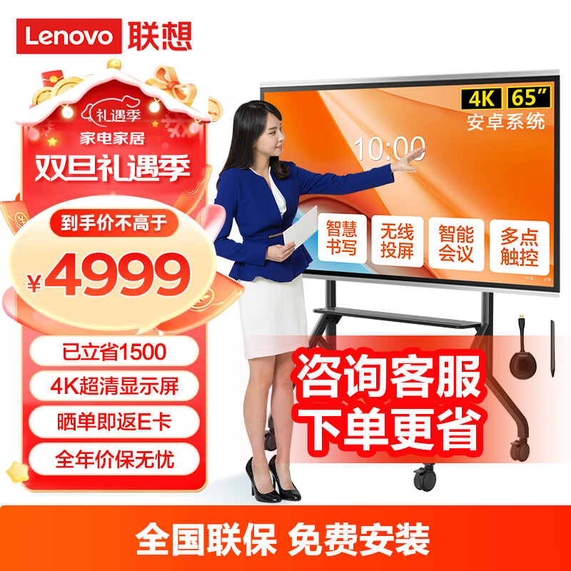 联想thinkplus会议平板一体机65英寸电子白板视频会议电视教学办公触控显示大屏 SE65+传屏器+移动支架价格:4999.00元!