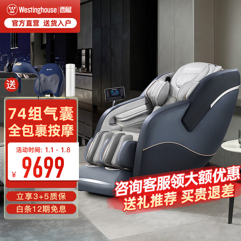 西屋(Westinghouse)S570按摩椅太空舱23年新款全自动多功能零重力家用按摩沙发电动高端甄选送老人父母礼物 S500-灰蓝色【节日生日礼物实用送爸爸妈妈】价格:15999.00元!