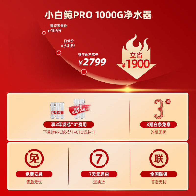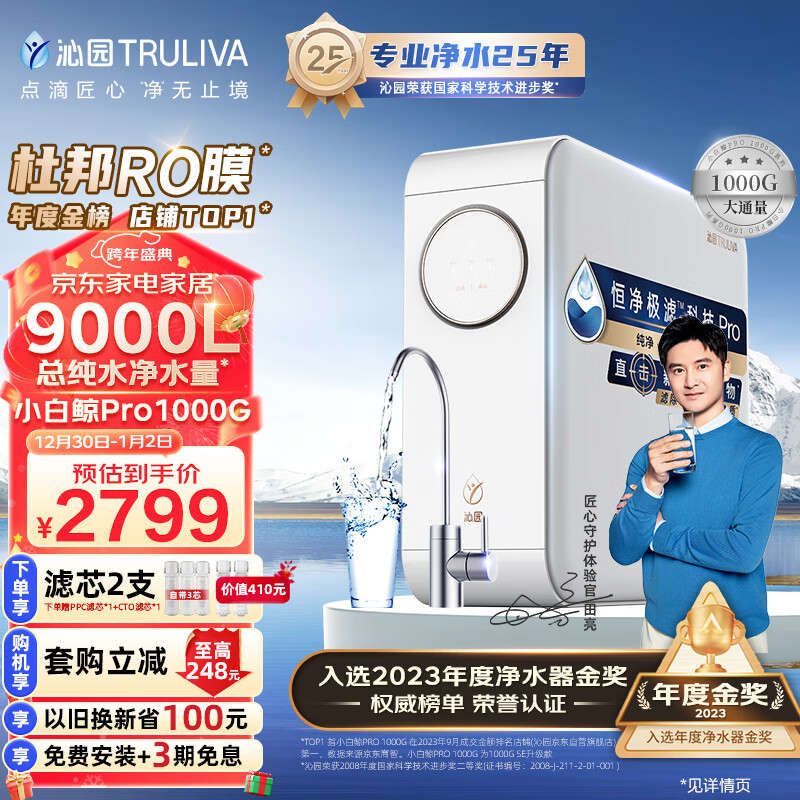 沁园(TRULIVA)小白鲸PRO大通量1000G家用净水器5年RO反渗透厨下直饮3L/分钟水 UR-S51046i价格:2799.00元!