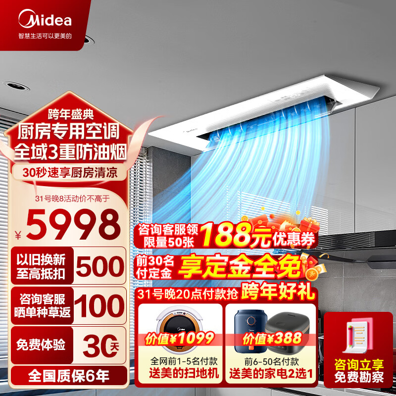 美的(Midea)厨清凉 厨房空调 专用嵌入式 一级能效变频1.5匹 家用集成吊顶制冷CKF-35FW/BN1Y-FG100【极地白】价格:5998.00元!