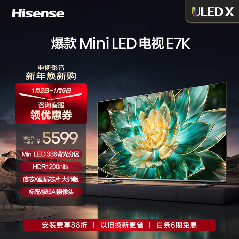 海信电视65E7K 65英寸 ULED X Mini LED 336分区 AI摄像头超感知 智慧屏 液晶智能平板电视机 以旧换新价格:5599.00元!