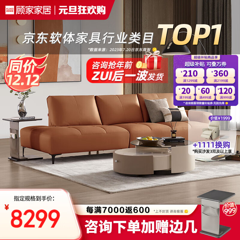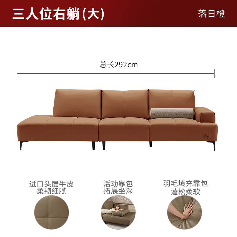 顾家家居(KUKA)皮沙发客厅靠包羽毛填充1213【落日橙】3人位自由躺右(2.92米)价格:8299.00元!