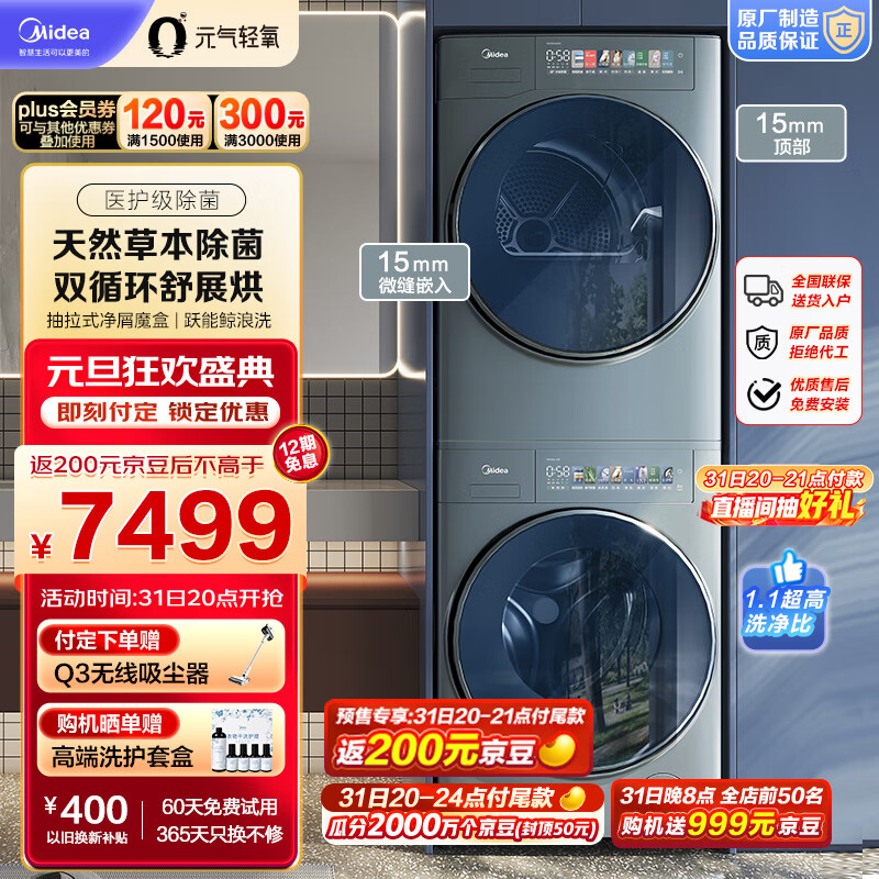 美的(Midea)10公斤滚筒洗衣机全自动+热泵烘干机家用 超薄全嵌 【元气轻氧】MG100LAIR+MH100IAIR3 洗烘套装价格:7699.00元!