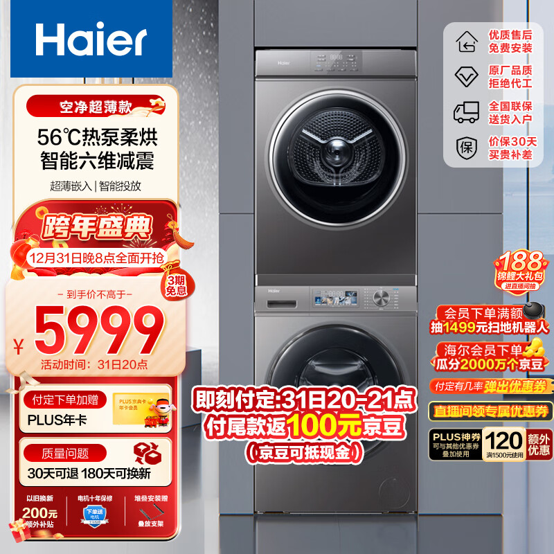 海尔(Haier)超薄全嵌洗烘套装 10Kg滚筒洗衣机全自动+热泵烘干机家用 3D净护内筒 六维减震智能投放 65+36套装价格:5999.00元!