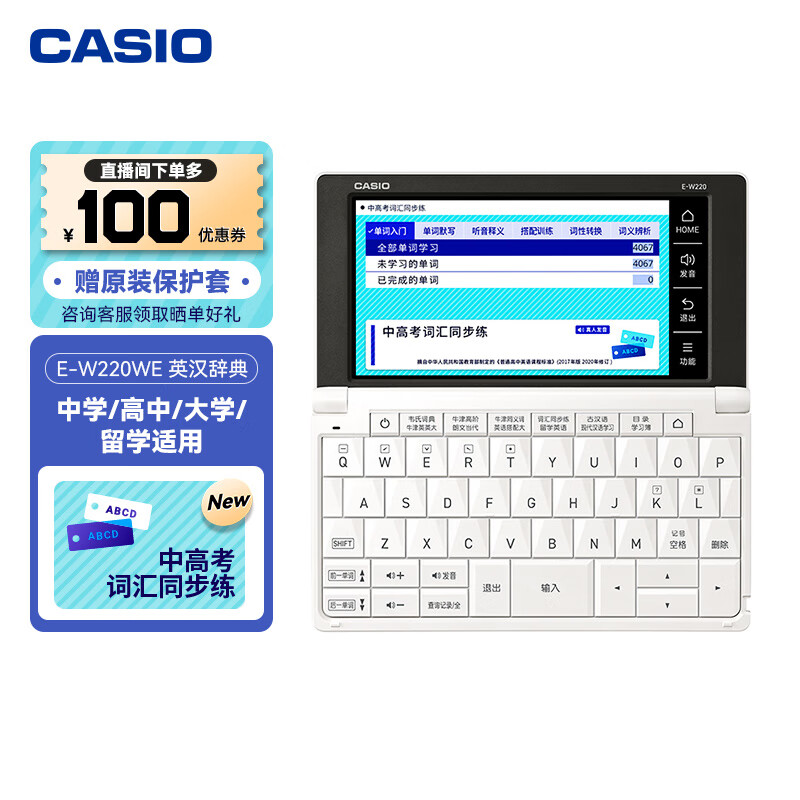 给大家分享下!实实在在的说这款卡西欧E-W220WE 英汉辞典、留学、雪瓷白的网友有不少,这回就给大家介绍一下,这个新出来的,很受欢迎,女儿对英语感兴趣,之前买的大字典基本没动过,这个确实方便好用。
