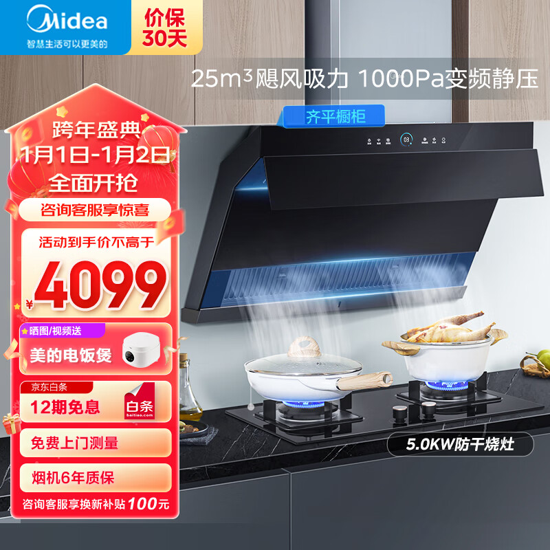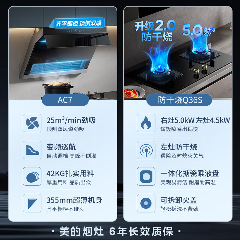 美的(Midea)抽油烟机灶具套装 顶侧双吸油烟机家用25风量变频巡航超薄双吸烟灶套装AC7+Q36S液化气套装价格:4099.00元!