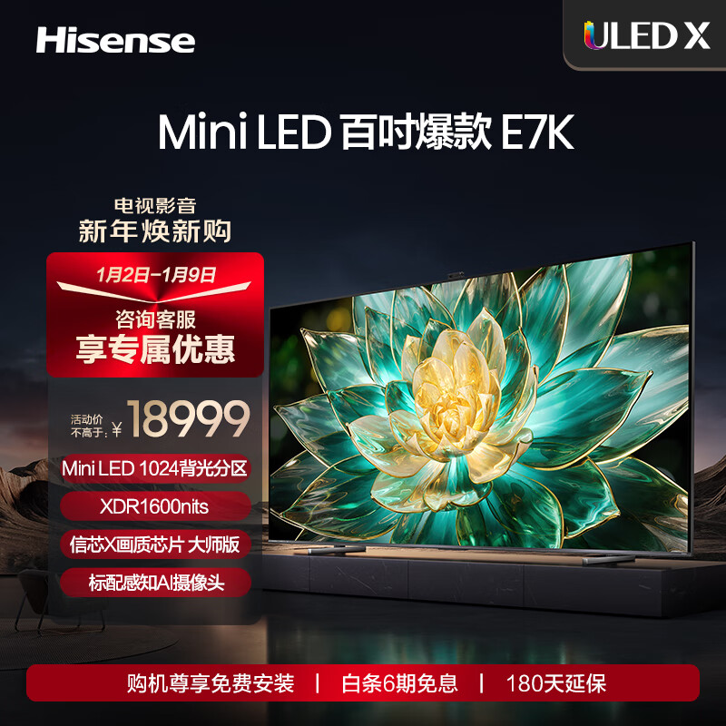 海信电视100E7K 100英寸 ULED X Mini LED 1024分区 XDR1600nits液晶智能平板电视机 以旧换新 98英寸+价格:18999.00元!