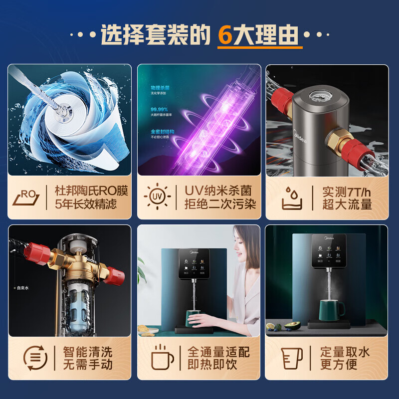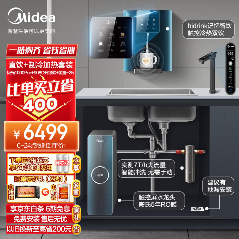 美的(Midea)省芯直饮冷热净水器套装【极光1000pro+管线机908D+前置-25pro】hidrink 壁挂式加热一体净饮机价格:6499.00元!
