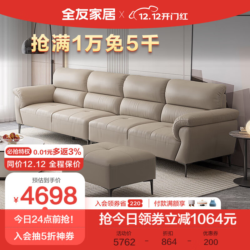 全友家居沙发简约风真皮沙发大象耳朵扶手中大户型直排座具价格:5762.35元!
