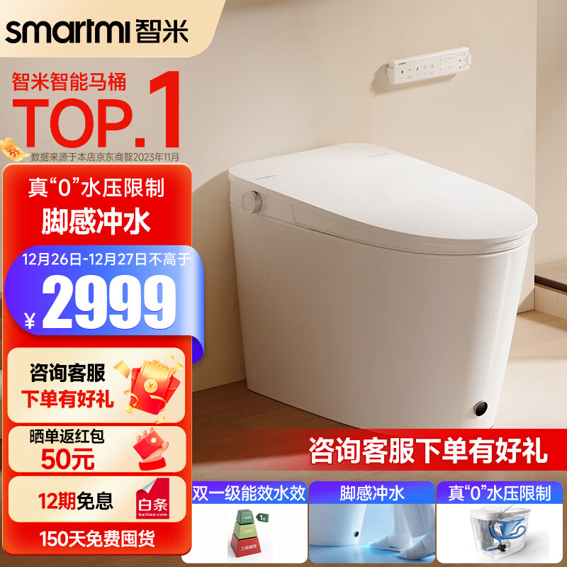 智米(SMARTMI)智能马桶一体机带水箱不限水压脚感冲水智能坐便器2S标准版 400坑价格:3499.00元!