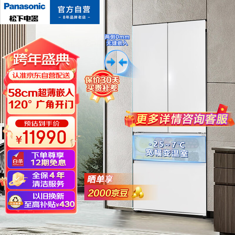 松下(Panasonic)大白PRO 464升家用多门冰箱一级能效四开门大容量580mm超薄嵌入法式冰箱NR-EW46TGB-W珍珠白价格:11990.00元!