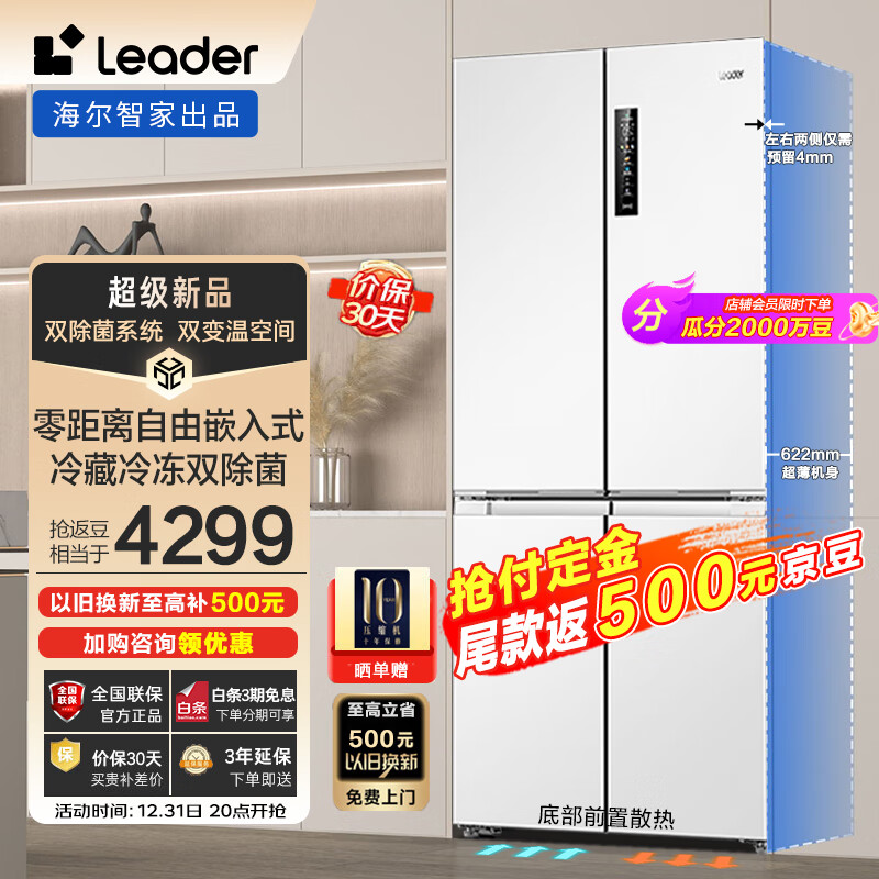 Leader 海尔智家出品502升白色风冷无霜一级四开十字对开门家用超薄零嵌冰箱BCD-502WGLTD49W9U1价格:4999.00元!