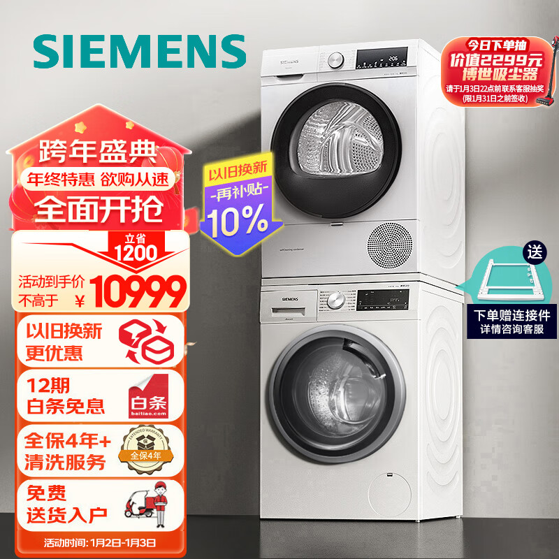 西门子(SIEMENS)洗烘套装 10kg除菌滚筒洗衣机+10kg热泵烘干机家用防缠绕 WM12P2602W+WQ55A2D00W价格:12199.00元!