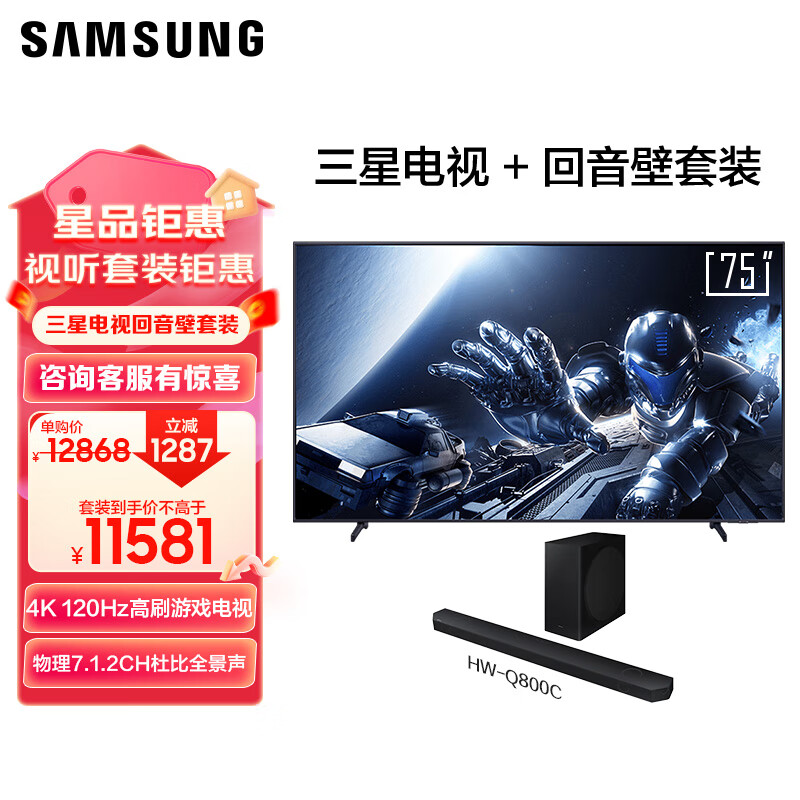 三星(SAMSUNG)75英寸 超薄游戏电视 QA75QX3CAJXXZ +三星HW-Q800C/XZ 全景音效 无线蓝牙回音壁视听套装价格:11581.20元!