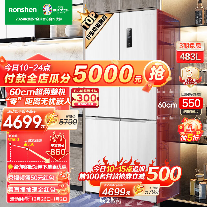 容声(Ronshen)60cm平嵌系列483升十字四开门一级变频超薄“零”嵌入底部散热大容量可嵌入冰箱 BCD-483WD3FPQ价格:5699.00元!
