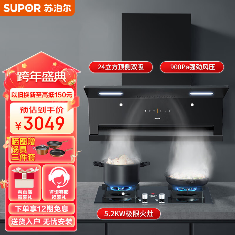 苏泊尔(SUPOR)抽油烟机 顶侧双吸油烟机灶具套装 24立方大吸力烟灶套装 家用油烟机燃气灶套装 DL36+DB70液化气价格:3149.00元!
