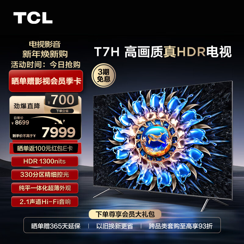 TCL电视 85T7H 85英寸 HDR 1300nits 330分区 4K 144Hz 2.1声道音响 客厅液晶智能平板游戏电视机价格:7999.00元!