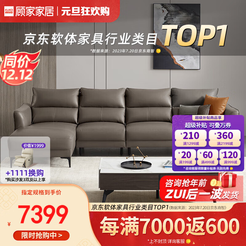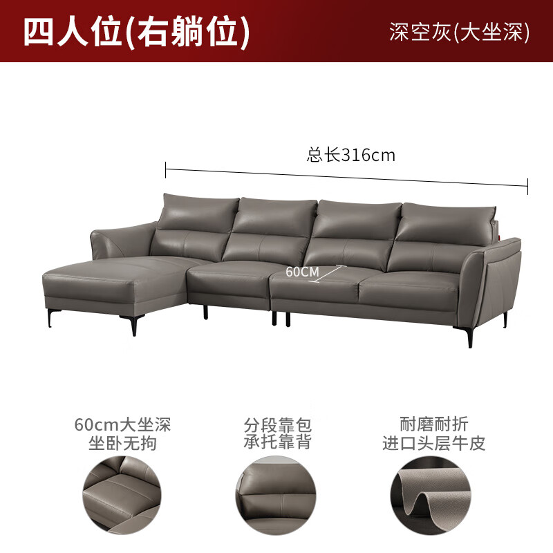 顾家家居(KUKA)皮沙发现代轻奢沙发客厅沙发1107【深空灰】四人位右躺位大坐深价格:7399.00元!
