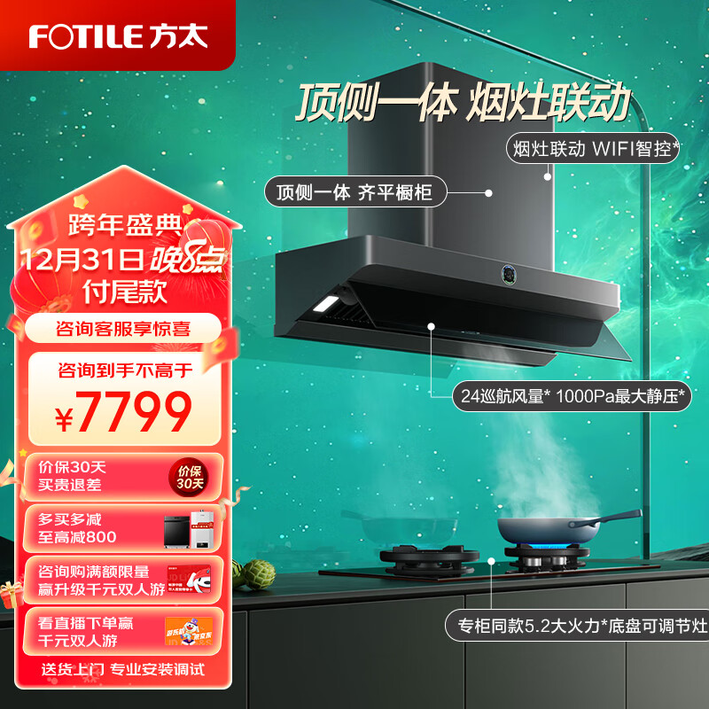方太(FOTILE)抽吸油烟机灶具套装 顶侧吸一体欧式 变频烟灶24巡航风量烟灶联动燃气灶套餐01-F2.i+02-HE01CB价格:7799.00元!