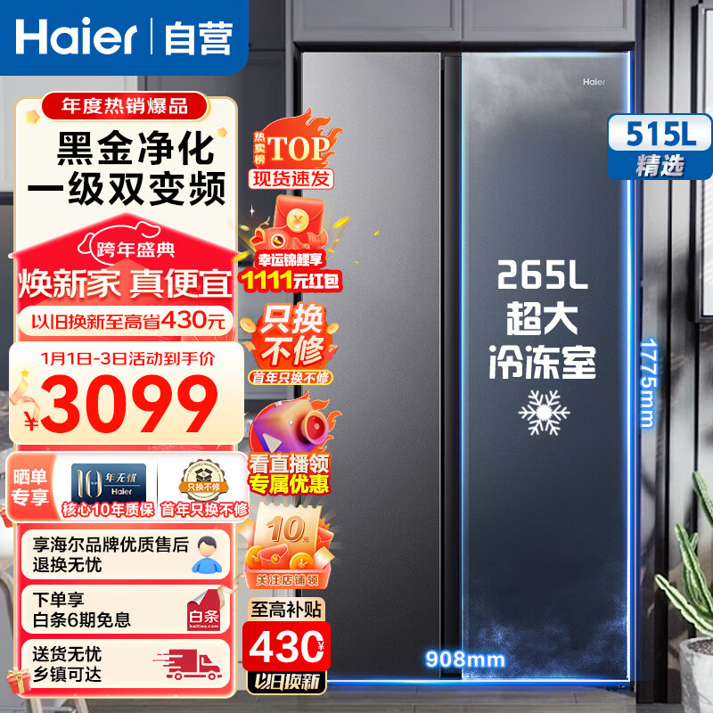 海尔(Haier)冰箱双开门对开门大冷冻一级能效双变频家用超薄风冷无霜智能黑金净化515L冰箱容量纤薄机身价格:2988.00元!