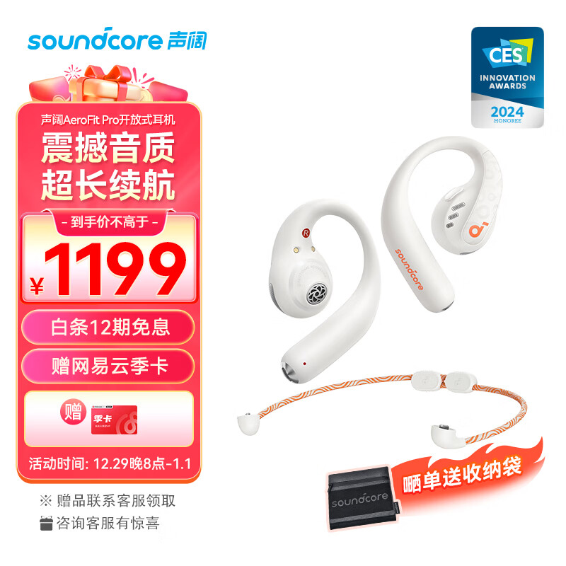 声阔飞跃线2合1不入耳蓝牙耳机AeroFit Pro开放舒适音质颠覆骨传导无线运动跑步骑行46H续航苹果华为白价格:1199.00元!