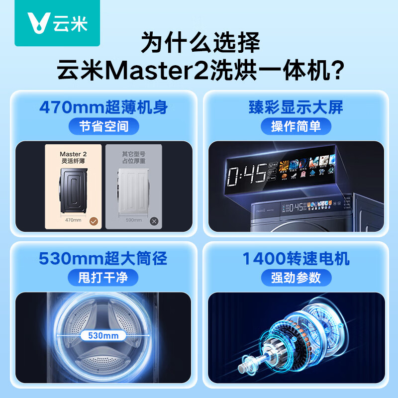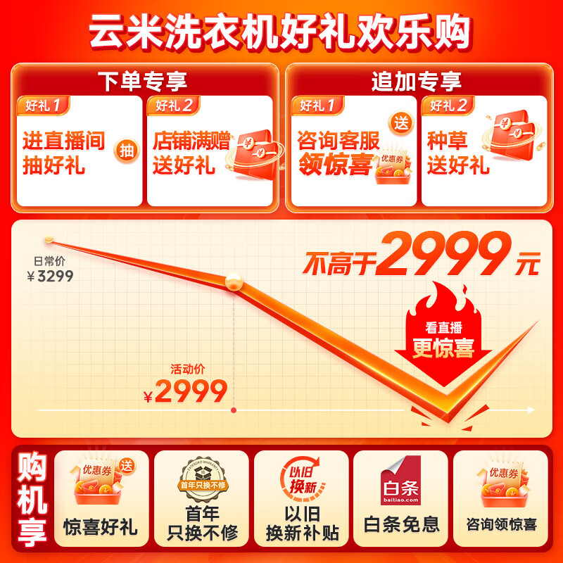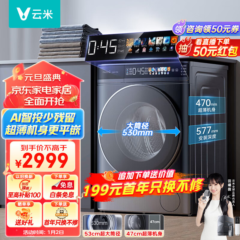 云米(VIOMI)滚筒洗衣机全自动 超薄全嵌 10公斤洗烘一体 彩屏 智能投放 除菌 Master2大筒径 WD10FT-G6A价格:2999.00元!