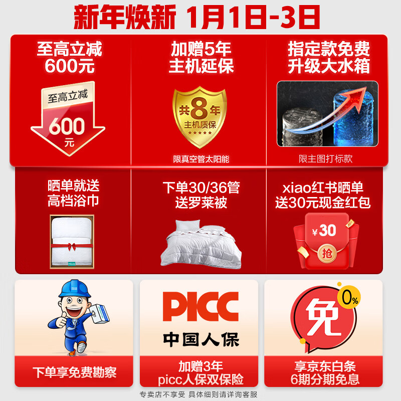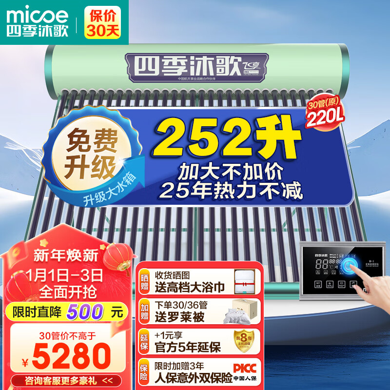 四季沐歌(MICOE)飞享太阳能热水器家用光电两用自动上水 预约电加热 水温水位显示 一级能效 送+装 30管220L价格:5780.00元!