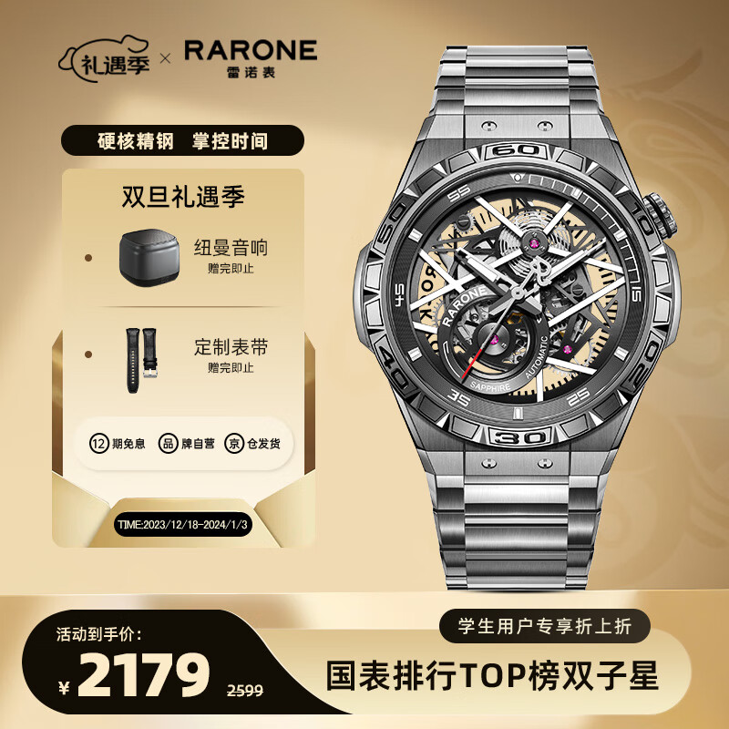 雷诺(RARONE)手表双子星Y国表男士机械手表镂空机械表钢带新年礼物送男友价格:2499.00元!