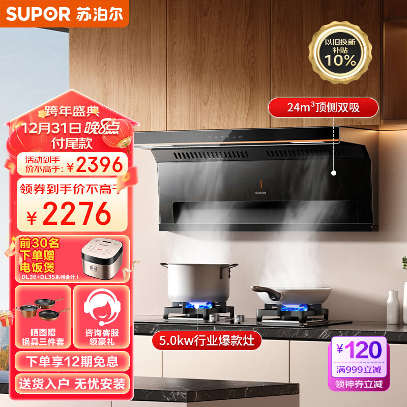 苏泊尔(SUPOR)抽油烟机 双腔拢烟顶侧双吸油烟机灶具套装 24立方吸力变频烟灶 家用油烟机燃气灶 DL35+Q5液化气价格:2495.00元!
