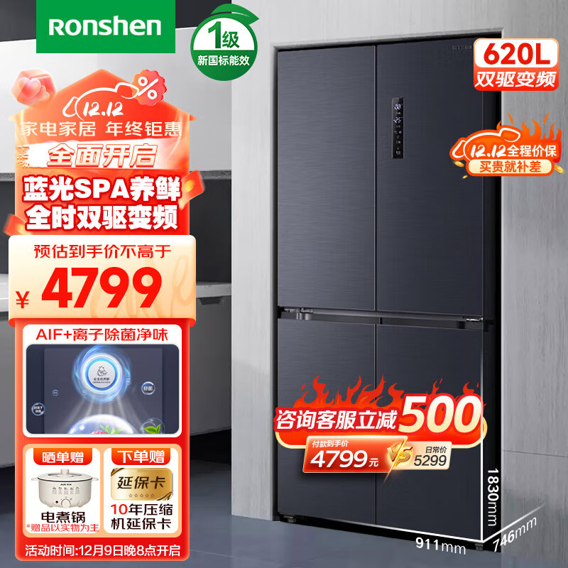 容声(Ronshen)620L十字对开四门大容量一级能效蓝光养鲜超薄变频风冷无霜冰箱BCD-620WD19FP价格:4999.00元!