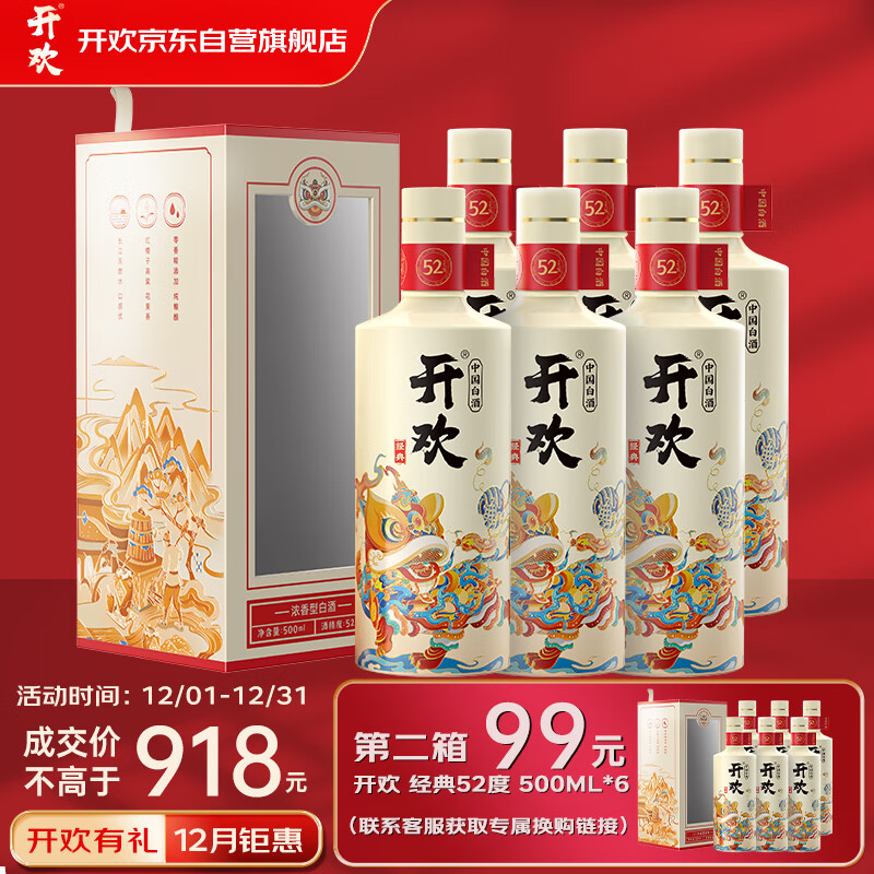开欢经典系列 浓香型白酒 52度 500ml*6瓶 整箱装价格:918.00元!