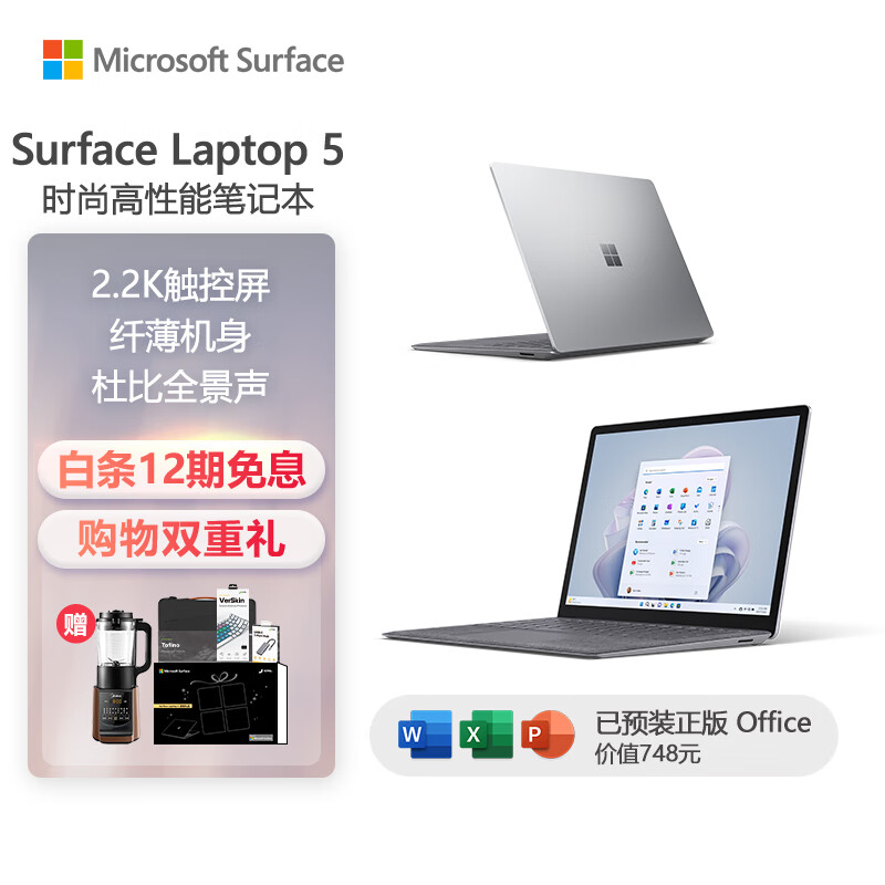 微软Surface Laptop 5 学生笔记本电脑 i5 16G+512G 亮铂金 Evo认证13.5英寸2.2K高色域触控屏价格:11788.00元!