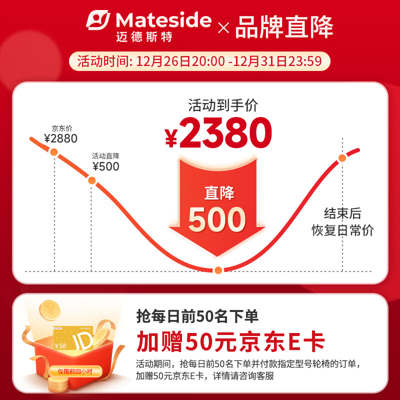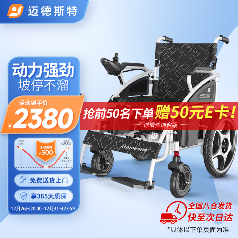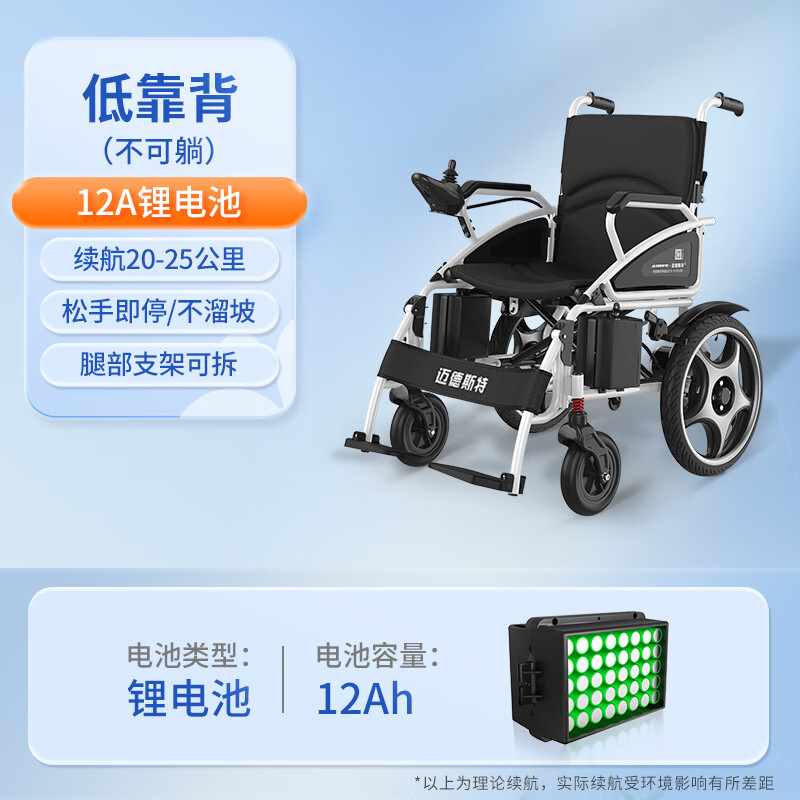 迈德斯特 电动轮椅车老人折叠轻便残疾人智能全自动老年轮椅【双减震+双电机+坡停不溜】801低靠背-12AH锂电价格:2380.00元!