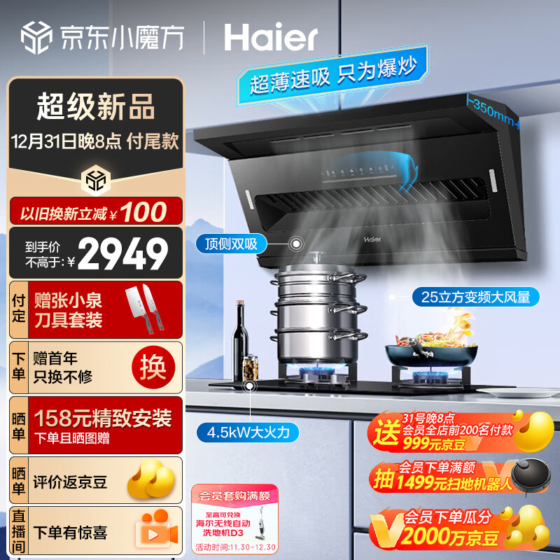 海尔(Haier)抽油烟机 顶侧双吸烟灶套装 变频25m3/min大吸力 挥手智控 家用油烟机燃气灶具套装C61+Q2BE2液价格:2949.00元!