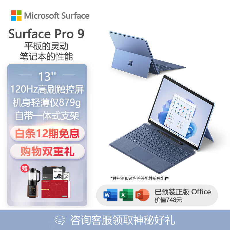 微软Surface Pro 9 二合一平板电脑 i7 16G+256G宝石蓝 13英寸120Hz触控屏 游戏平板 笔记本电脑价格:12588.00元!