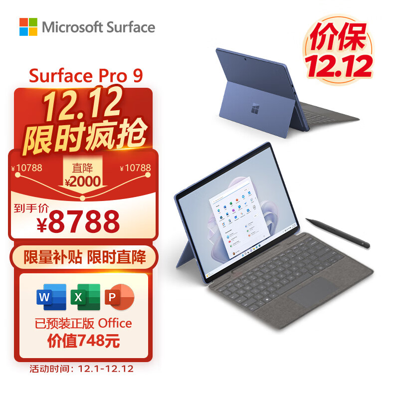 微软Surface Pro 9 宝石蓝+亮铂金带触控笔键盘盖 i5 8G+256G 二合一平板电脑 13英寸120Hz触控屏 办公笔记本价格:8788.00元!