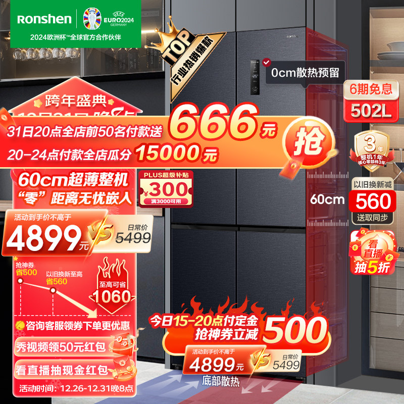 容声(Ronshen)【60cm平嵌】502L十字双开四开门多门超薄零距离嵌入式一级变频底部散热家用无霜超大容量冰箱 灰色 星空灰BCD-502WD1FPQ价格:5399.00元!