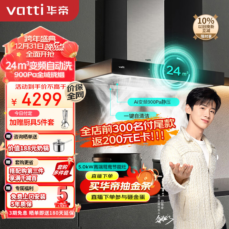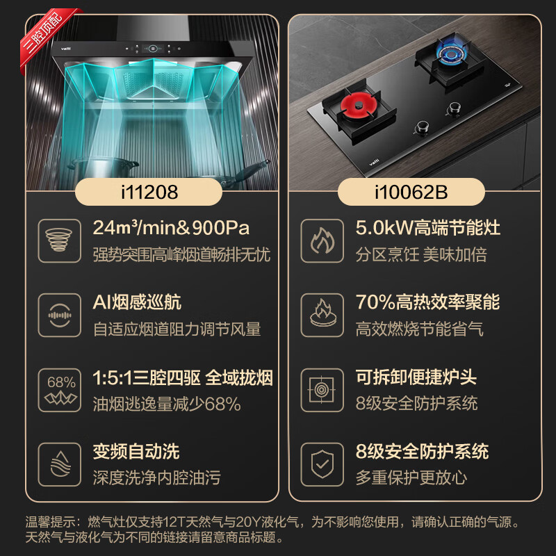 华帝(VATTI)抽油烟机顶吸三腔三吸变频S8欧式家用大吸力油烟机鸳鸯灶具套装 24风量自动洗i11208+62B(天然气)价格:4298.00元!