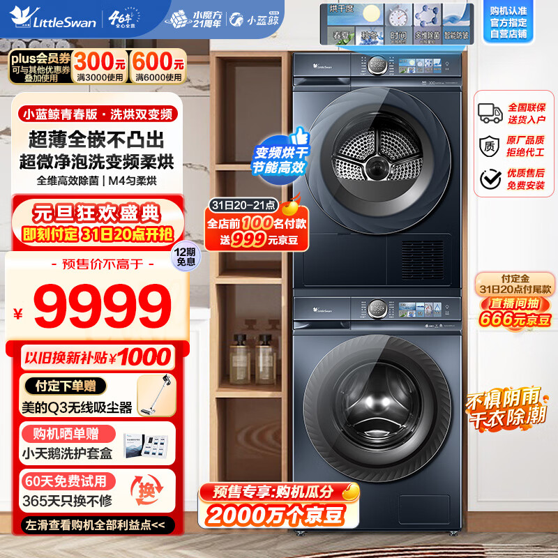 小天鹅(LittleSwan)洗烘套装 10KG滚筒洗衣机全自动+热泵烘干机 超薄全嵌超微净泡【小蓝鲸青春版】TG100V86PLUS+VH88价格:9999.00元!